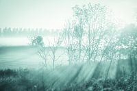 Vlaamse velden in het eerste zonlicht . De zonnestralen spelen door de ochtendmist .