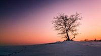 zonsopkomst op de drunense duinen. Eenzame boom in de sneeuw.