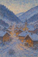 In de stilte van de avond begint het alpendorp te gloeien. Kleine ramen flikkeren tegen de sneeuw en werpen zachte amberkleurige halo's onder een violetblauwe hemel. De lucht zoemt van stille verwachting - een stilte die alleen wordt verbroken door het gefluister van vallende vlokken en het vage geklingel van klokken in de verte. Deze…