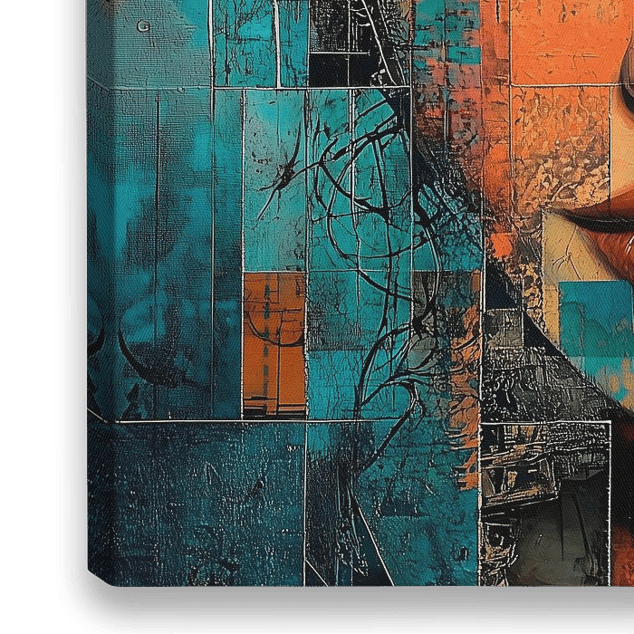 Een artistiek portret van een vrouw met levendige ogen. Haar gezicht is een mozaïek van kleurrijke vierkanten en abstracte patronen en gestructureerde elementen, met een opvallend contrast tussen warme oranje tinten en koele blauwe tinten op de achtergrond. De stijl combineert elementen uit popart en straatgraffiti, waardoor een…