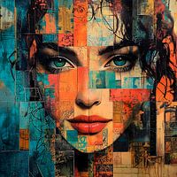 Een artistiek portret van een vrouw met levendige ogen. Haar gezicht is een mozaïek van kleurrijke vierkanten en abstracte patronen en gestructureerde elementen, met een opvallend contrast tussen warme oranje tinten en koele blauwe tinten op de achtergrond. De stijl combineert elementen uit popart en straatgraffiti, waardoor een dynamische visuele compositie ontstaat die de aandacht trekt.