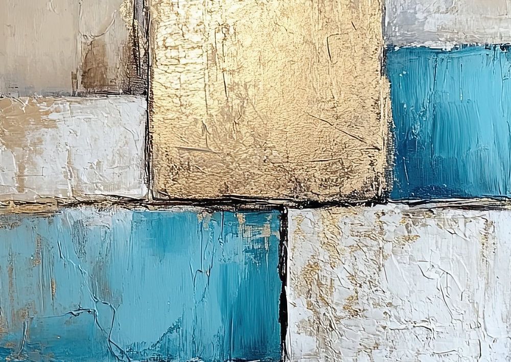 Details: abstract, schilderij, blokken, goud, blauw, grijs, textuur, kunst, moderne kunst, compositie