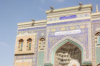 Dit werk toont een rijk gedecoreerde gevel waarin kleur, patroon en symmetrie samenkomen. De imposante boog vormt het hart van het beeld en trekt de blik naar binnen, terwijl de omliggende mozaïeken en kalligrafische lijnen het geheel omarmen. Blauwe en gouden tinten domineren en creëren een spel van diepte en ritme. Elk detail lijkt…