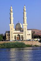 Sprookjesachtige moskee in Egypte langs de rivier de Nijl, vlakbij de stad Aswan. Met de rivier aan de ene kant en eindeloze woestijn aan aan de andere kant steekt deze prachtige bouwwerk verboven uit tegen de blauwe lucht. Egyptenaren zijn trots op hun religie en zorgen goed voor hun Moskeeën, die ook dan druk worden bezocht