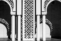 De zwart-wit foto toont een stukje van de gevel van een moskee in Marokko. Door het ontbreken van kleur komt de structuur en textuur van de gevel sterk naar voren. De witte muren, zorgvuldig voorzien van uitgesneden patronen en symbolen, benadrukken de symmetrie en details die kenmerkend zijn voor islamitische architectuur. In zwart-wit…