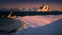 Moskeense eiland in de sneeuw met de Lofoten-archipel op de achtergrond bij zonsondergang, Noorwegen