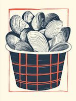 Een abstracte mand vol grote mosselen, in een grafisch krachtige stijl met zwarte en witte lijnen en een strak rood kader. De eenvoud maakt dit werk juist opvallend. Prachtig in een minimalistisch interieur of restaurant.
