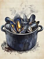 Een stomende zwarte pan vol geopende mosselen, prachtig gedetailleerd met blauwe en gele accenten. Een culinair eerbetoon in potloodstijl voor iedereen die houdt van zee en smaak.