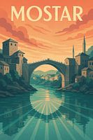 Deze art-decoposter toont de charme van Mostar, Bosnië en Herzegovina, met de iconische Stari Most - de legendarische Ottomaanse brug die sierlijk over de rivier de Neretva buigt. Warme zonsondergangtinten verlichten de stenen torens, minaretten en huizen aan de rivier, terwijl zonnestralen over het water weerkaatsen en de tijdloze…
