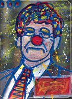 Kunstzinnig modern eigentijds kunstwerk van een zakenman in pak met een clownsneus.