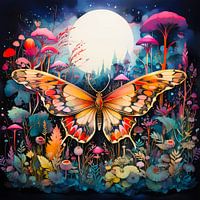 Nachtvlinder onder de maan in prachtige kleurrijke bloemen en paddenstoelen
