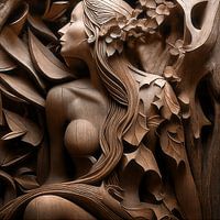 Een vrouw uit hout gesneden, gekerfd in een boom en één met de natuur.