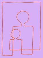 Mother and Child in Purple/Orange line, komt uit de serie, familie-lijntekeningen. Deze tekening geeft de bijzonder sterke verbondenheid van ouder en kind weer. Deze personen zijn verbonden door één lijn wat de krachtige band nog meer benadrukt.
