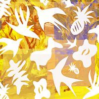 Dit kunstwerk maakte ik op basis van een eigen gemaakte schilderij en hand uitgesneden figuratieve vormen van wit papier, zorgvuldig samengesteld en digitaal perfectioneerd. Naast deze gele versie zijn er ook rode, blauwe en groene versies. Leuk als individueel kunstwerk maar ook aan de muur om 2 of meer samen te stellen.