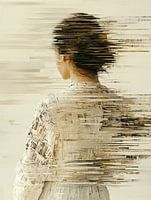 Motion Blur - Dit vrouwen schilderij met een abstracte stijl toont een vrouw van achteren, waarbij haar figuur en haar opgaan in een dynamisch veld van overlappende, horizontale penseelstreken in aardetinten.