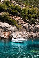 Mooie foto met een boot voor de kust van Zakynto. Het ligt voor een klif in het turquoise water van Griekenland...
