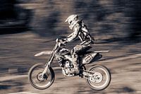 Een motorcrosswedstrijd in Noord-Hessen bij Kelze. De achtergrond is onscherp gemaakt door de camera mee te trekken. Een motorfoto vol actie in zwart-wit.