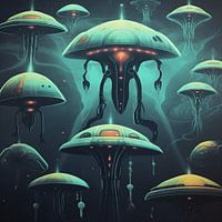 Engines of the Unknown geeft een betoverend beeld van zwevende buitenaardse machines die zweven in een uitgestrekte, donkere vlakte. Elk van de complexe structuren straalt een zachte, griezelige gloed uit en verlicht de omringende leegte met mysterieus licht. De compositie combineert sciencefiction-esthetiek met een surrealistische…