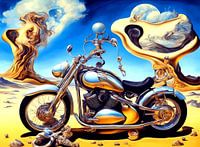 De gestroomlijnde motorfiets staat glimmend van chroom in een woestijnachtig landschap. De omgeving lijkt te zijn ontsproten aan een surrealistische droom.