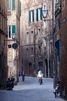Motorrijder in smal, middeleeuws steegje in de oude Toscaanse stad Siena. Het beeld is gemaakt in de vroege ochtend waardoor er een prachtig licht zich langs de middeleeuwse huizen vleit.