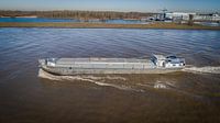 Bekijk dit prachtige binnenvaartschip varend op de rivier de Waal. De luchtfoto van dit motorvrachtschip is genomen ter hoogte van de nederlandse biesbosch. De naam van het schip is : MI barco