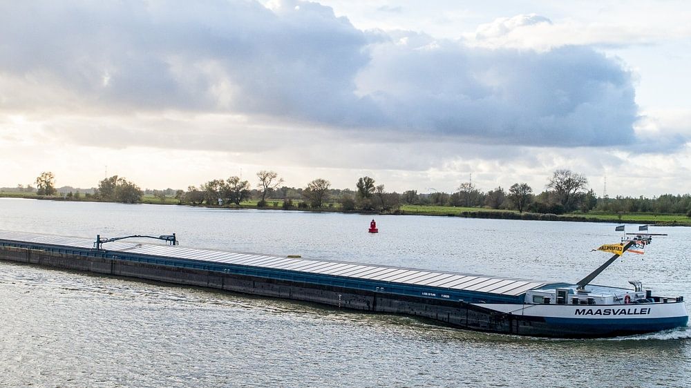 Bekijk dit prachtige binnenvaartschip varend op de rivier de Waal. De luchtfoto van dit motorvrachtschip is genomen ter hoogte van de nederlandse biesbosch. De naam van het schip is : Maasvallei