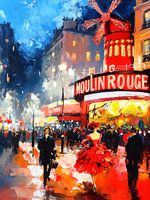 Schilderij van het beroemde Moulin Rouge in Parijs. 's Avonds krijgt Parijs een heel ander aanzien. Parijs wordt ondergedompeld in de avondverlichting, wat het nog romantischer en fabelachtiger maakt.