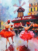 Schilderij van het beroemde Moulin Rouge in Parijs. 's Avonds krijgt Parijs een heel ander aanzien. Parijs wordt ondergedompeld in de avondverlichting, wat het nog romantischer en fabelachtiger maakt.