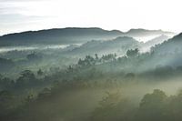 Foto van het tropisch regenwoud voor Mount Agung. Prachtige lijnen in het landschap en diverse kleuren groen, gehuld in nevel. Grijs, wit, lichtgroen, mosgroen, blauwgroen, geelgroen. Foto genomen in Sidemen Bali. Rijstvelden.