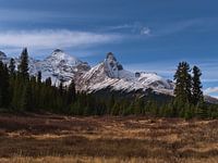 Zicht op de Rocky Mountains in de herfst met bruin gekleurd grasland omringd door groene naaldbossen en de besneeuwde toppen van de ruige Mount Athabasca en Hilda Peak op de achtergrond op een zonnige dag op de Icefields Parkway.