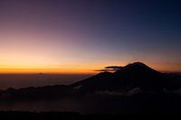 Mount Batur bij zonsopkomst. Warme kleuren van oranje, paars, geel en blauw. Bergen steken als een silhouet af tegen de kleuren van de zonsopkomst. Vulkanen eiland Bali, Indonesië.