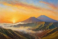 Mount Bromo ontwaakt onder een vurige zonsopgang, zijn rokende krater omlijst door in mist gehulde bergkammen en gloeiende hellingen. Het impressionistische palet mengt levendige sinaasappels, paars en goud met het koele blauw van de omringende bergtoppen. Golven van mist rollen door de caldera en verzachten het dramatische landschap…