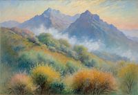 Gesluierd in wervelende mist, duikt de berg Olympus op door zachte lagen van zilver, lavendel en gedempt groen. De impressionistische techniek vervaagt berg en lucht tot een dromerig geheel dat mythe en mysterie oproept. Dit schilderij nodigt de kijker uit in het legendarische huis van goden en tijdloze verhalen.