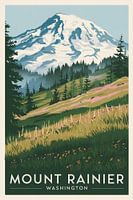 Een indrukwekkend uitzicht op de majestueuze toppen van Mount Rainier, omlijst door weelderig groen en bloeiende weiden. Het harmonieuze kleurenpalet en de nostalgische stijl geven dit kunstwerk een uitnodigende sfeer. Het is ideaal voor in de woonkamer, neemt elke kijker mee naar de schoonheid van de natuur en creëert een ontspannen…