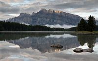 Panoramafoto met ochtendsfeer bij Two Jack Lake met de weerspiegeling van Mount Rundle in Banff National Park, Alberta, Canada