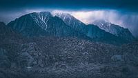 Een machtig tafereel boven de bergen van de Sierra Nevada. Een storm die zich ontwikkelt en bliksemflitsen die de wolken oplichten. Als je de auto links onder ziet staan, heb je een idee, hoe groots deze omgeving is.