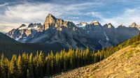 De bergpieken bij het adembenemende Moraine Lake, een bergmeer in Banff National Park in de Canadese provincie Alberta, op 14 kilometer van het dorp Lake Louise. Het meer ligt in de Rocky Mountains, in de Valley of the Ten Peaks, op een hoogte van 1885 meter. Het heeft een oppervlakte van 50 hectare. Foto genomen bij zonsopkomst, het gekende gouden uur.