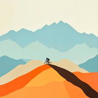 Een eenzame fietser worstelt over zacht glooiende heuvels, te midden van een spectaculair kleurenpalet van warme sinaasappels en koel blauw. De zachte silhouetten van de bergen op de achtergrond creëren een harmonieuze rust, terwijl de kronkelende weg uitnodigt tot nieuwe avonturen. Een gevoel van vrijheid en ontdekking hangt in de lucht.