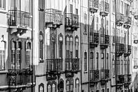 Zwart-witfoto van huisgevels met typische balkons in de wijk Mouraria in de oude stad van Lissabon in Portugal.
