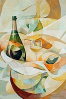 Het samenspel van zachte kleuren en dynamische vormen creëert een feestelijke sfeer. Een elegante fles, gehuld in stijlvolle rondingen, rust naast een glazen vat. De sfeer vloeit tussen de geometrische structuren en wekt de verwachting van genot en feestelijke momenten wanneer de sprankelende wijn sprankelend in het glas glijdt.