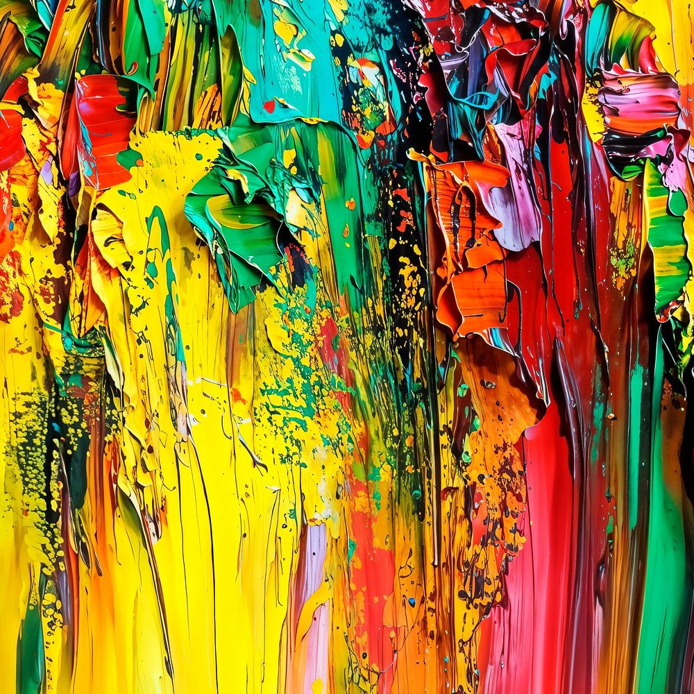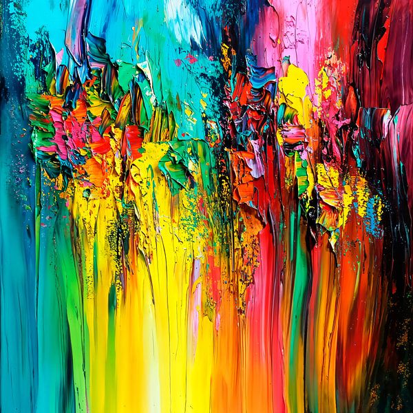 Een abstract expressionistisch kunstwerk met een levendige en chaotische explosie van kleuren, de kleuren zijn aangebracht in een dynamische, verticale stroom, wat een gevoel van beweging en energie suggereert. De algehele indruk is er een van intense emotie en rauwe artistieke expressie.
