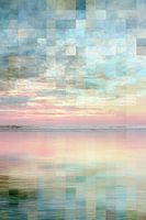 Dit abstracte mozaïek kunstwerk legt een rustig zeegezicht vast waar lucht en water oplossen in een zachte harmonie van pasteltinten. Subtiele vierkanten en gelaagde texturen vormen een rasterachtige compositie die de scène voorzichtig fragmenteert, waardoor een vertrouwde horizon verandert in een contemplatieve visuele ervaring.…