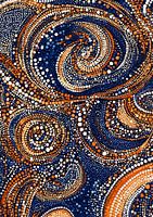 Een gedetailleerd, abstract kunstwerk, geïnspireerd op de patronen van Aboriginal dot painting. Het werk bestaat uit fijne ontwerpen in aardse tinten zoals bruin en blauw, met een mozaïekachtige structuur waarin de stippen speels gerangschikt tegen de achtergrond. Verschillende vormen, cirkels, spiralen en andere patronen, vloeien in elkaar over en creëren samen een intrigerende compositie die de traditionele Australische kunststijl weerspiegelt.