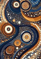 Een gedetailleerd, abstract kunstwerk, geïnspireerd op de patronen van Aboriginal dot painting. Het werk bestaat uit fijne ontwerpen in aardse tinten zoals bruin en blauw, met een mozaïekachtige structuur waarin de stippen speels gerangschikt tegen de achtergrond. Verschillende vormen, cirkels, spiralen en andere patronen, vloeien in elkaar over en creëren samen een intrigerende compositie die de traditionele Australische kunststijl weerspiegelt.