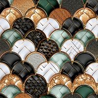 De afbeelding toont een decoratief mozaïekpatroon in de vorm van visschubben met metalen contouren. Elke individuele schub heeft verschillende texturen en kleuren, waaronder zwart, wit, groen, goud en koper. De oppervlakken variëren van glanzend en glad tot gestructureerd en gedessineerd. Het ontwerp ziet er luxueus en driedimensionaal uit, met de nadruk op geometrische variatie en een verfijnde uitstraling.