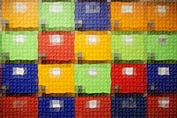 Mozaïek van vierkanten in de kleuren groen, rood, geel en blauw. De vlakken vormen een kleurrijk en vrolijk geheel. Leuk om een donkere saaie plek in een modern interieur op te vrolijken