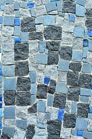 Oppervlak van de gevel van een huis met kleine mozaïeksteentjes die deel uitmaken van een grote muurschildering van de kunstenaar Bert Heller. Het gebouw is het Café Moskau in Berlijn, dat in 1964 in de DDR werd geopend.