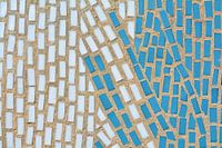 Oppervlak van de gevel van een gebouw met kleine mozaïeksteentjes die deel uitmaken van een grote muurschildering. Het gebouw is het computercentrum in Potsdam in Duitsland.