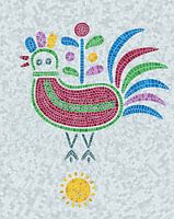Decoratieve compositie met gekleurde duif in mozaïektegels, grafische illustratie geïnspireerd op traditioneel Hongaars borduurwerk
