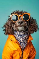 Een charmante Mudi met krullend, pluizig bont straalt persoonlijkheid uit. Hij draagt een feloranje zonnebril, een stijlvolle jas en een kleurrijke sjaal en belichaamt de perfecte combinatie van stijl en levensvreugde. Deze kleine viervoeter is klaar voor avontuur en onvergetelijke momenten en zal zeker de aandacht trekken!